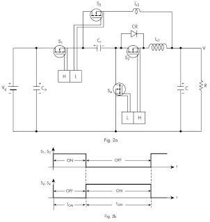 It operates at 50KHz switching frequency, uses 10 nH inductors (PCB loops), and can have very low losses (less than 1%)